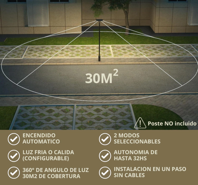 - PANEL SOLAR: 10V 11.5W - BATERIA DE LITIO: LIFEPO4 38.4WH - POTENCIA: 20W - LUMENS MAX: 2300LM - MATERIAL ABS+PC ANTI UV - ANGULO DE HAZ: 360 GRADOS - COLOR DE LUZ: 4000K + 6000K - APTO POSTE RECTO - DIMENSIONES 40*12CM ---ENCENDIDO: BOTON ENCENDIDO/APAGADO (UNA VEZ ENCENDIDO EL ARTEFACTO POR LAS NOCHES TRABAJARA EN FORMA AUTOMATICA) - FUNCIONES: ***MODO LUZ TENUE*** EL EQUIPO TRABAJARA AL 50% DE INTENSIDAD EN FORMA CONSTANTE. AUTONOMIA 12-14 HORAS - ***MODO LUZ FUERTE*** - EL EQUIPOS TRABAJARA AL 100% DE INTENSIDAD EN FORMA CONSTANTE. - AUTONOMIA 10-12 HORAS -TIEMPO DE CARGA 6-8 HORAS