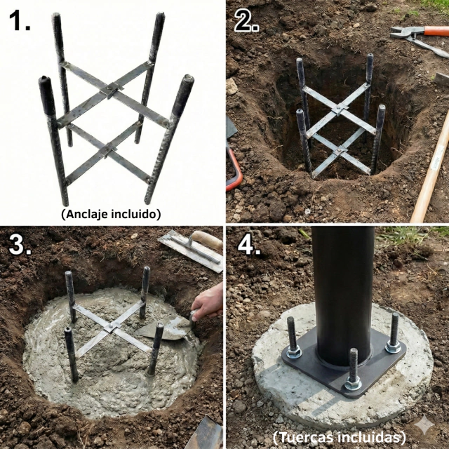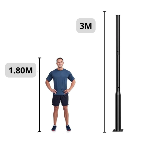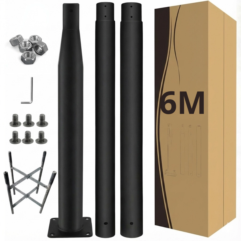 - MATERIAL: Q235 ACERO GALVANIZADO - COLOR NEGRO - PESO 27 KG - BASE 220*220*7,5MM - DIMENSIONES CAJA 1520*240*230 MM - GROSOR 2,0 MM - DIAMETRO TRAMO SUPERIOR 60MM - DIAMETRO TRAMO INFERIOR 115 MM - ALTURA 3 METROS -TRAMO FINAL 6 CM