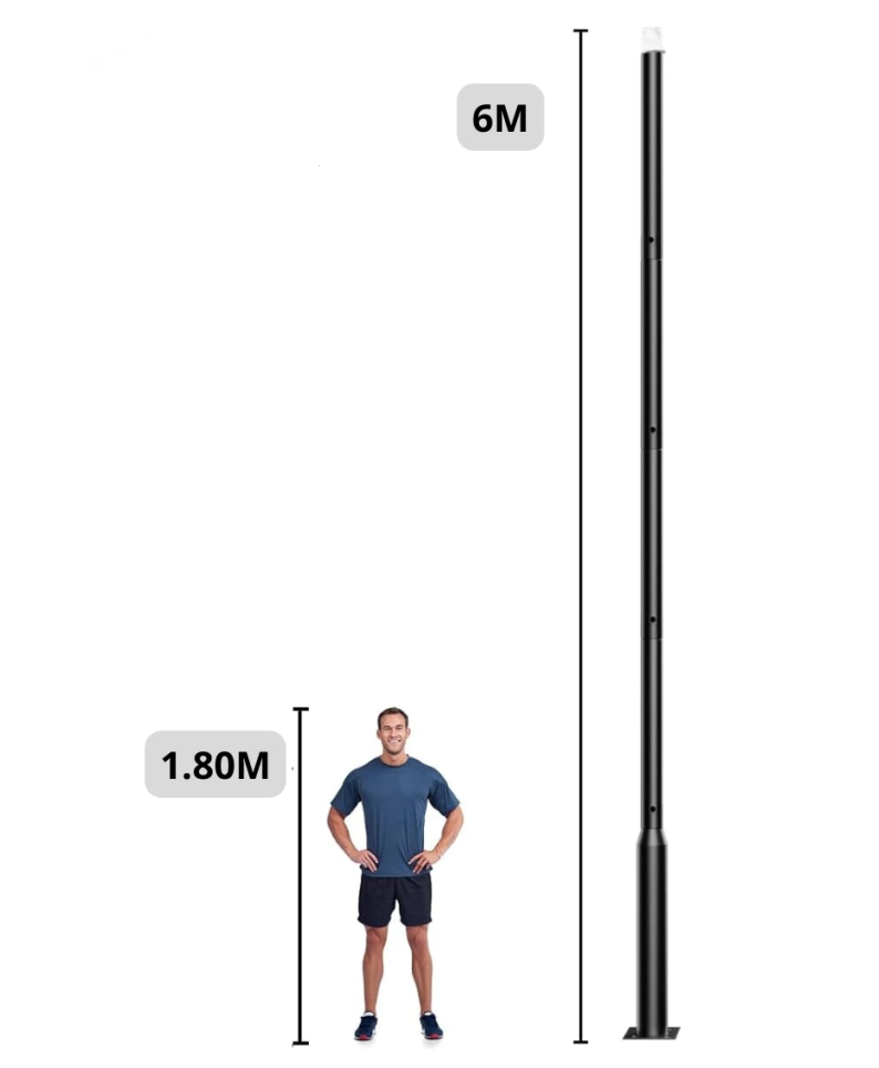 - MATERIAL: Q235 ACERO GALVANIZADO - COLOR NEGRO - PESO 27 KG - BASE 220*220*7,5MM - DIMENSIONES CAJA 1520*240*230 MM - GROSOR 2,0 MM - DIAMETRO TRAMO SUPERIOR 60MM - DIAMETRO TRAMO INFERIOR 115 MM - ALTURA 6 METROS -TRAMO FINAL 6 CM