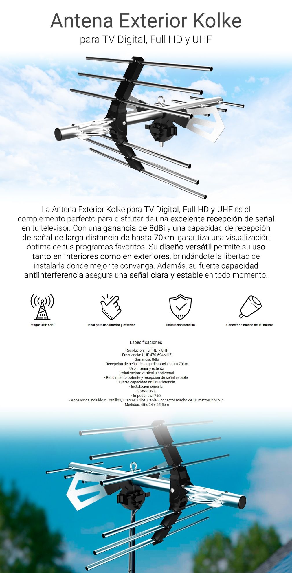 ANTENA DIGITAL DE EXTERIOR RESOLUCION FULL HD Y UHF. GANANCIA 8 DBI. RECEPCION DIGITAL DE LARGA DISTANCIA HASTA 70KM. ACCESORIOS INCLUIDOS: TORNILLOS, TUERCAS, CLIPS, CABLE F CONECTOR MACHO DE 10 MTS 2.5C / 2V.